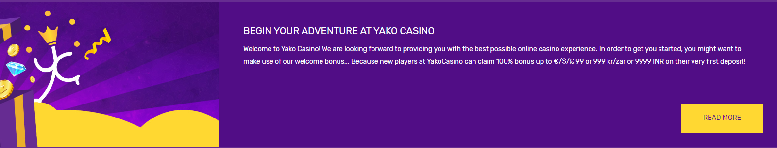 Yako Casino ble først etablert i 2015, eid av L&L Europe Ltd Casinos. Som også eier andre populære kasinoer som No Bonus Casino og All British Casino. De har et fantastisk rykte i casinobransjen så du er i trygge hender! Yako Casino har en lilla, gul og hvit sentrert fargedesign. Alle tilgjengelige spill er kategorisert etter live-spilleautomater, videoautomater, jackpot osv. slik at du kan finne det du leter etter.